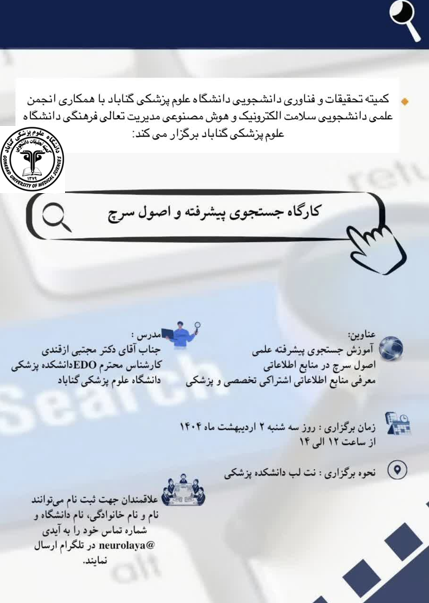 کمیته تحقیقات و فناوری دانشجویی دانشگاه علوم پزشکی گناباد با همکاری انجمن علمی دانشجویی سلامت الکترونیک و هوش مصنوعی مدیریت تعالی فرهنگی دانشگاه علوم پزشکی گناباد برگزار می کند: