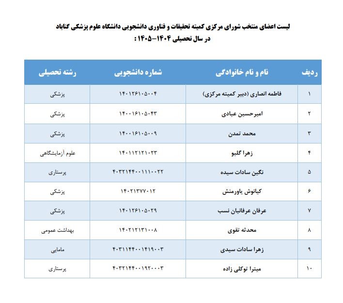 از بین 31 رزومه ارسال شده جهت شرکت در فراخوان جذب اعضای شورای مرکزی کمیته تحقیقات و فناوری دانشجویی دانشگاه علوم پزشکی گناباد بر مبنای فرآینده مقایسه ای، تعداد ده نفر از دانشجویان به عنوان اعضای منتخب شورا به شرح ذیل برگزیده شدند: